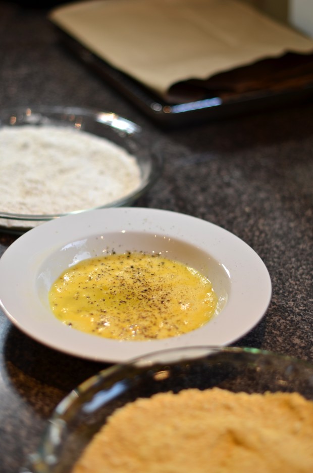 Get out three shallow dishes (I use pie plates or something along those lines) and put the flour, beaten eggs and cornmeal in their own special container. Season each with salt and pepper. Oh, and set out a brown paper bag or paper towels on a cooling rack so you can de-grease your tomatoes after you fry them.