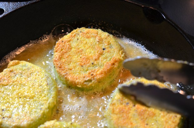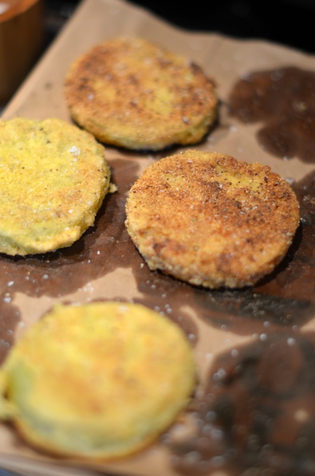 Grab your cast iron skillet or other heavy-bottomed pan and add the oil to about 1/4″. Heat over medium. Take your tomatoes (why don’t you season those too?) and dredge in flour, then egg, then cornmeal and drop them straight into the hot oil.