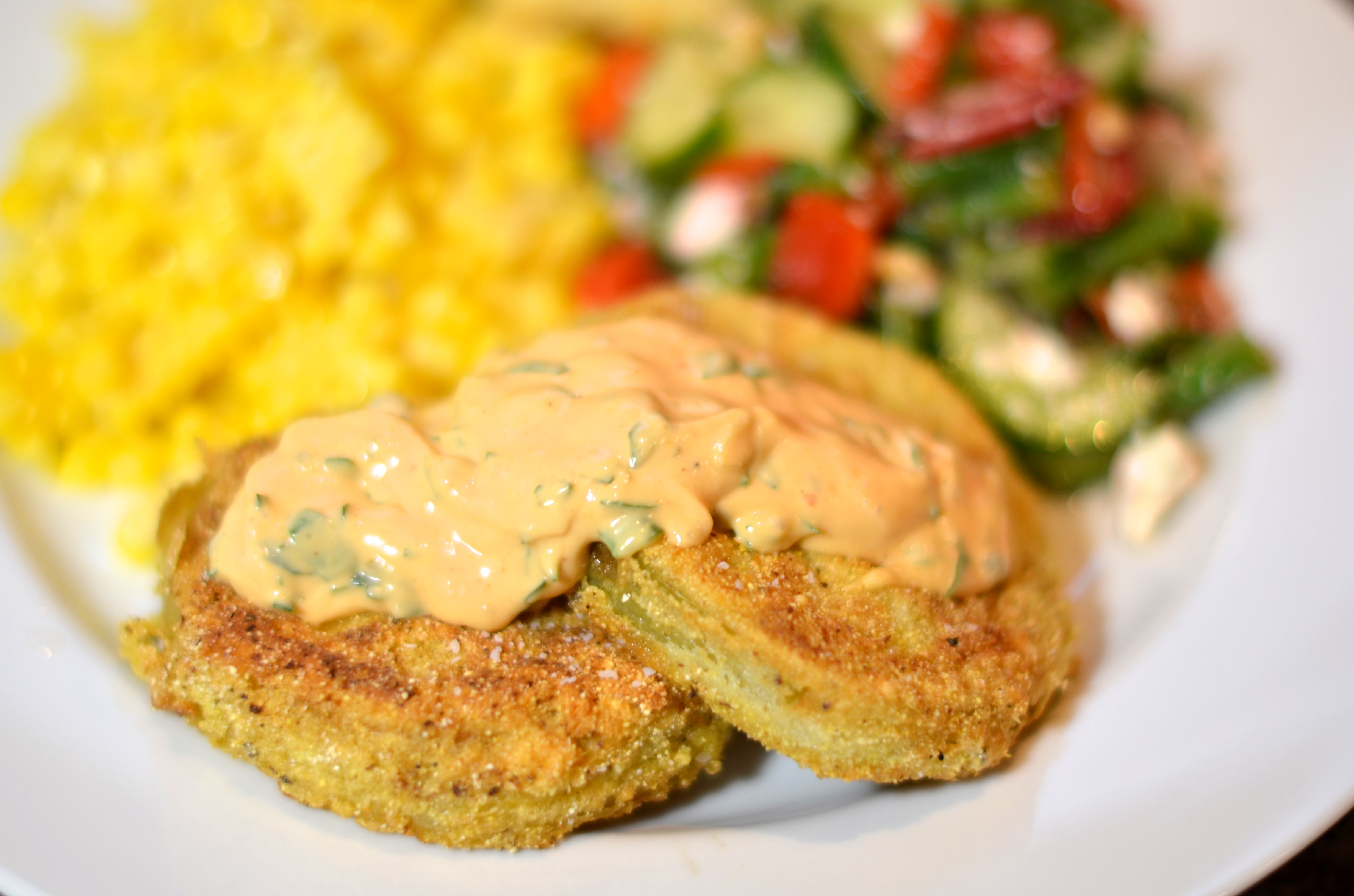 Now all that’s left to do is to eat the damn things. The husband decided to whip up some remoulade, the official sauce of his family. I just poured some blue cheese dressing on mine. But they’re great without anything on top. Or on a fried green tomato BLT.