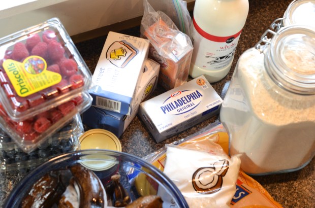 Still adhering to the “you can freeze it” rule of dropping off food, I went straight to breakfast breads and sweets. And I got a little carried away. Let’s just say that they should be square on baked breakfast goodies through the holidays. I ended up making this coconut-raspberry banana bread, a blueberry cake and my mother-in-law’s holiday cream cheese coffee cake. And as a survivalist, I made enough to stock my freezer as well. Call me selfish if you want, I think I’m resourceful.