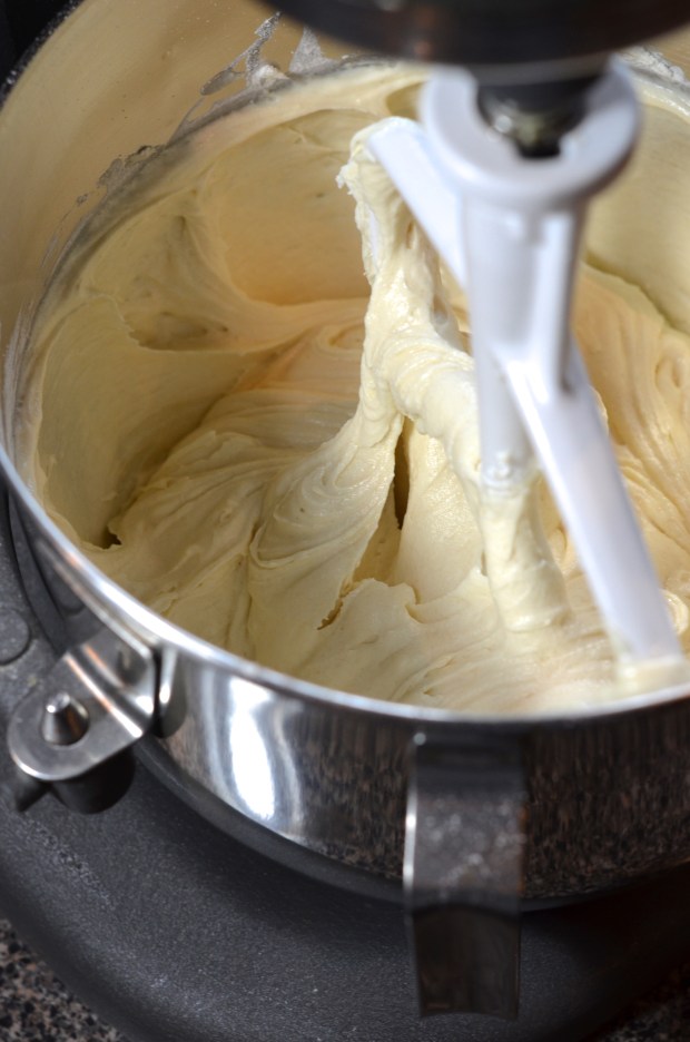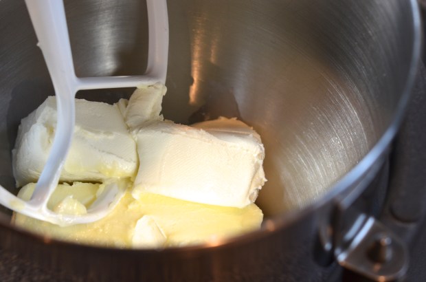 Luckily you don’t need quite as much stuff for this recipe alone. Preheat your oven to 350°F. To get started, cream together the butter and cream cheese until light and fluffy, then add in the sugar and eggs and give it another spin.