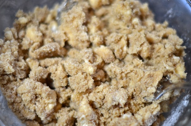 Pour the batter evenly among the three foil pans (that you have greased and floured) and prep the topping. In a small bowl, mix together (either by hand or with a couple forks) the butter, flour, brown sugar and pinch of salt.