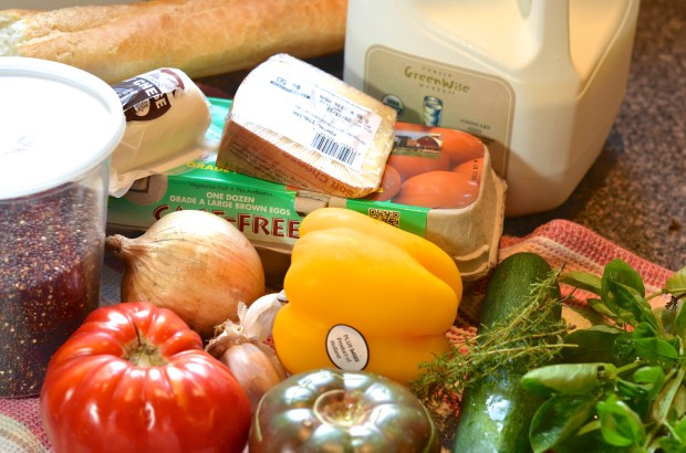 Because of its proteinitude, it’s a great thing to keep on hand. I try to cook a vegetarian meal at least once a week but usually we end up eating meat-free even more. I found a recipe for a quinoa bake in an issue of Cooking Light and, as I am wont to do with recipes from that magazine, I decided to fatten it up and try it at home. This can be a side or a whole meal, depending on the agreeableness of whom you’re trying to feed. This has a lot of ingredients. Feel free to limit them as you see fit.