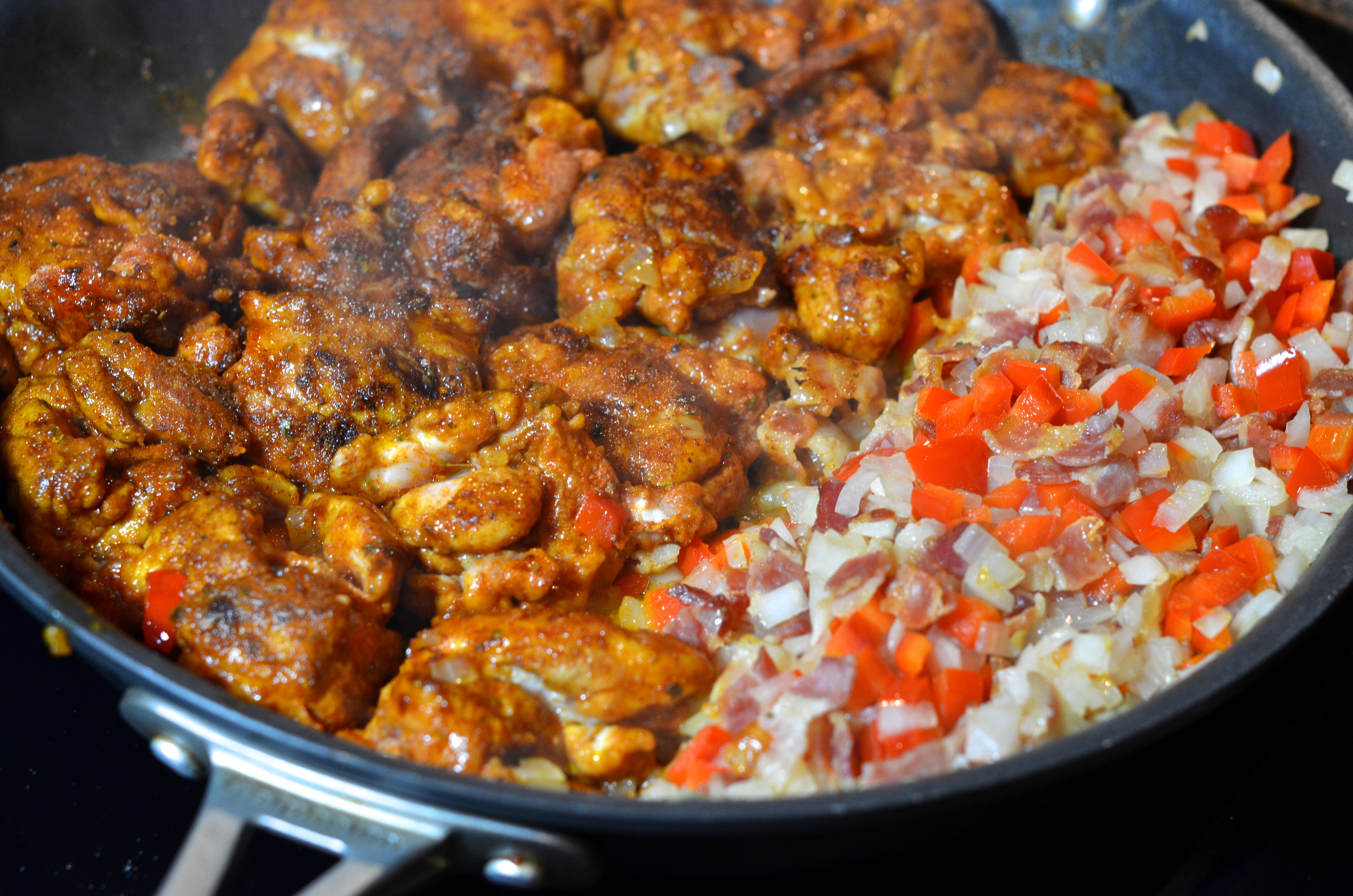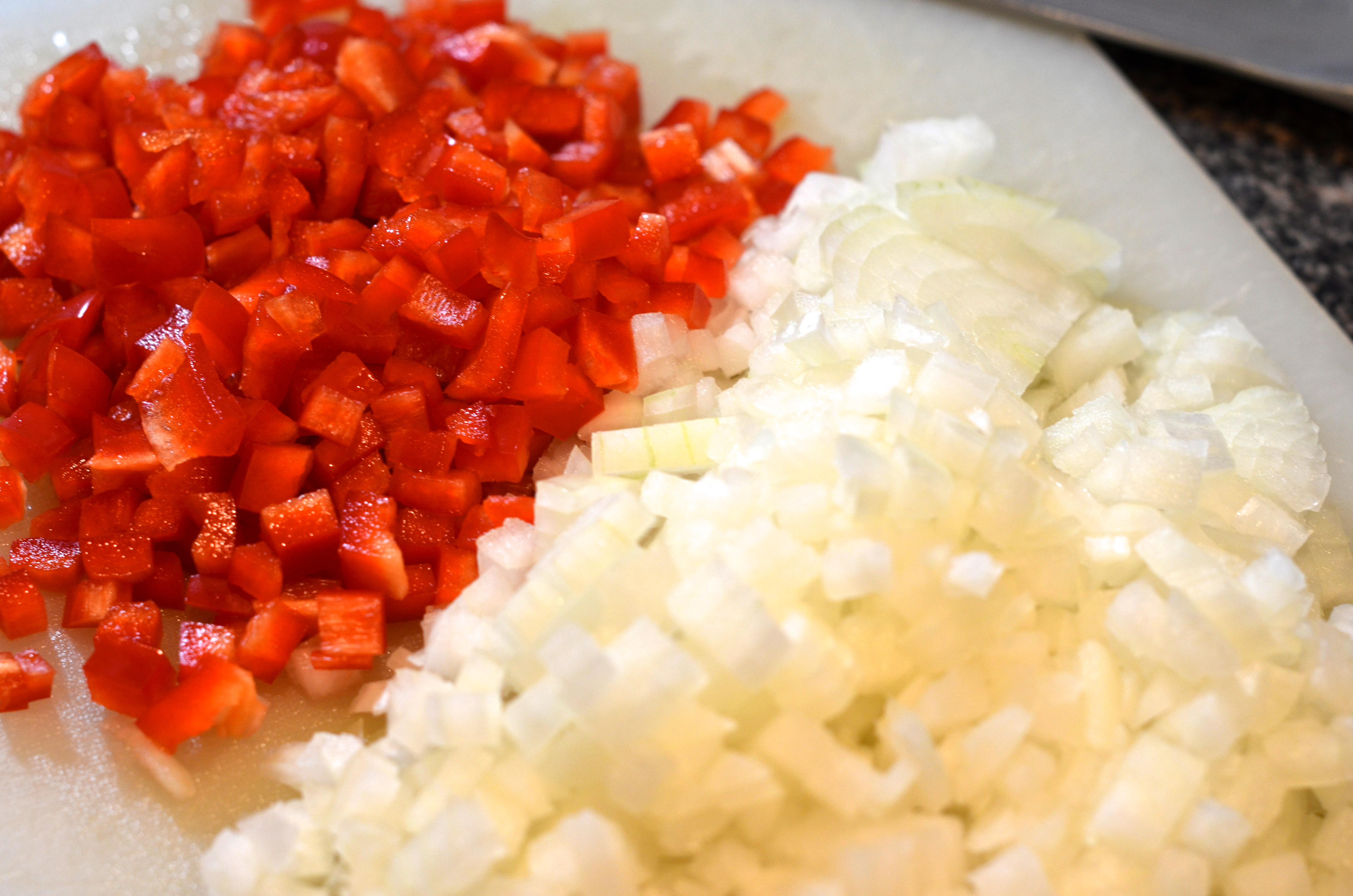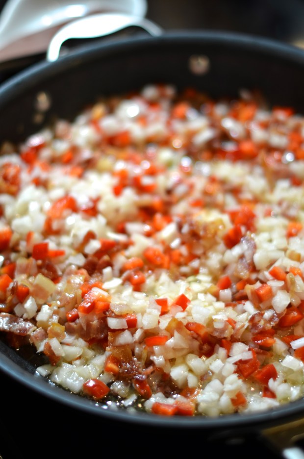 Let’s get started. Heat a large skillet (that has a lid) over medium heat and begin sautéing your bacon (don’t use the lid now though). While that’s going down, dice your pepper and onion and have at the ready.