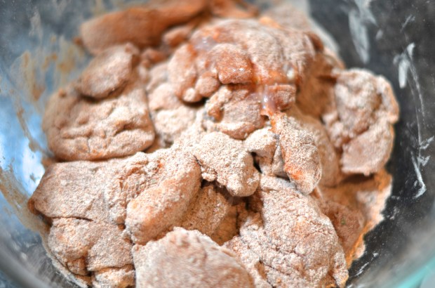 Ok, go ahead and grab a large bowl and add the flour, paprika, marjoram and some salt and pepper. Toss the chicken thighs (feel free to use breasts if you prefer. I don’t judge.) in the mixture until everyone is nicely coated.