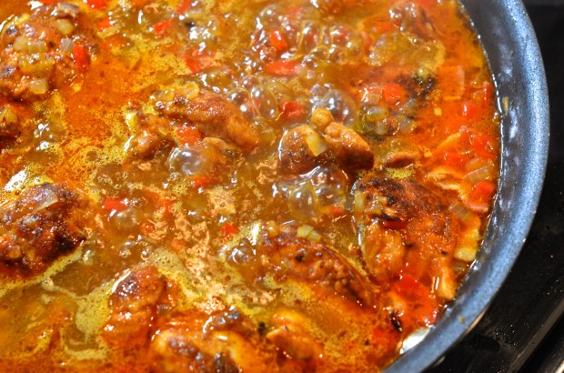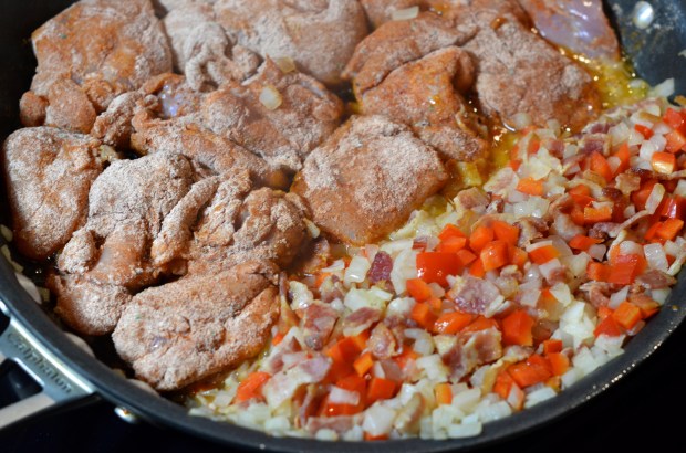 Things got weird here. I think this could go one of two ways. You could pull out the bacon, pepper and onion mixture and then brown your chicken, or you can push the stuff to the side and cram the chicken in there (which I did). Somehow it all fit, but it wasn’t really necessary. Also, be sure to add the rest of the flour and paprika mixture from the bowl to the pot. You’ll want that to thicken things up. I forgot that part so later on in the game I ended up putting 2 tablespoons of flour in a Pyrex measuring cup and adding some of the hot chicken stock to it and whisking the lumps away. I added that back to the sauce to get things a bit thicker. It helped.