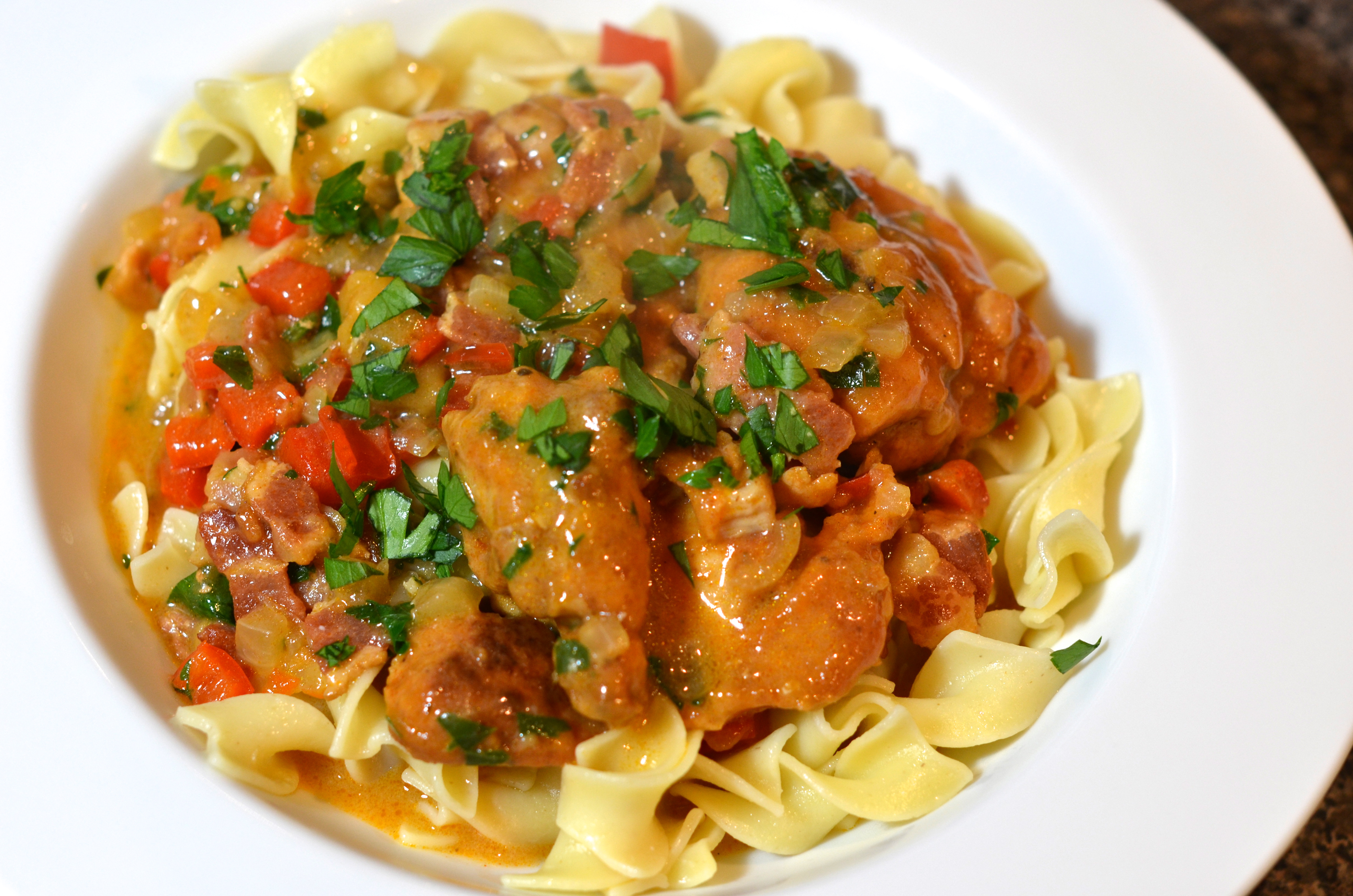 Prior to seeing this recipe I had never even heard of chicken paprikash. Immediately, I mentally lumped in it with goulash, given that there are things like noodles, sour cream and paprika in it and it has a slightly eastern European sound to it. It ended up being pretty tasty and might have been even better the next day. Like a haircut.