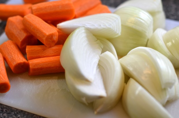 If there is a ton of fat at the bottom of the Dutch oven, go ahead and dump it out. If it’s a reasonable amount (say, a tablespoon or so), leave it in there so you can coat the veggies. Keeping the pot over medium to medium-high heat, add the onion and carrots to the dutch oven and cook for about 3-4 minutes or until they get a bit of color on them from grabbing the tasty bits on the bottom of the pot.
