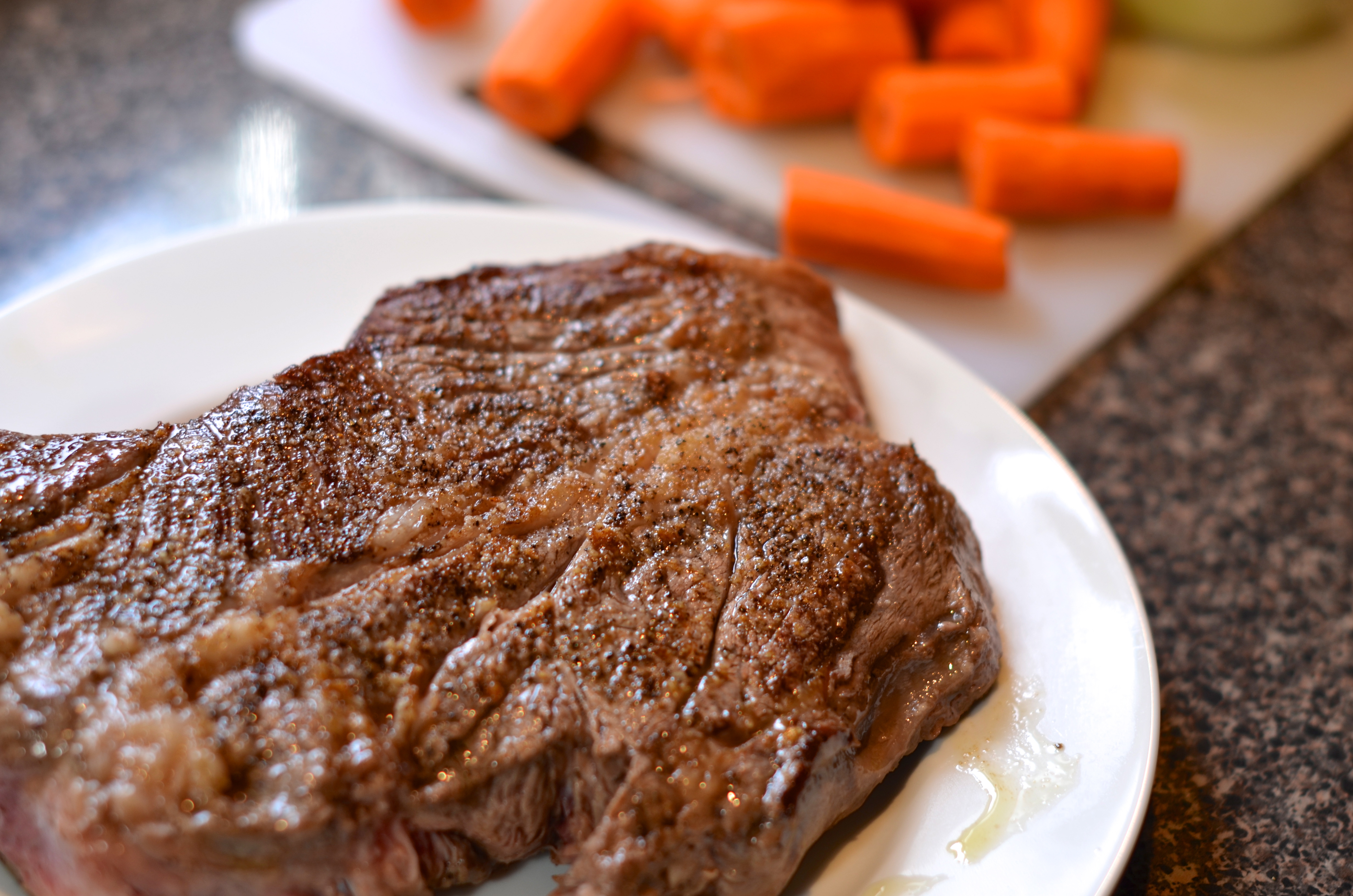 In celebration of mom’s birthday this year, once again, I broke out my good friend chuck and despite the husband’s protestations (which were later recanted), made up some old school pot roast. This ain’t sexy folks. This isn’t dinner party food and as you’ll soon see, it definitely isn’t the best subject for food photography (how do you make stewed meat look good?). What it is, however, is delicious. It’s warm and familiar and tastes like something you should eat on a cold, rainy afternoon. It’s also ridiculously easy, which is probably the best part of all. I’m sure you could adapt this recipe for a slow cooker if you prefer; I just decided to use my oven and a big covered casserole dish and leave it at that.