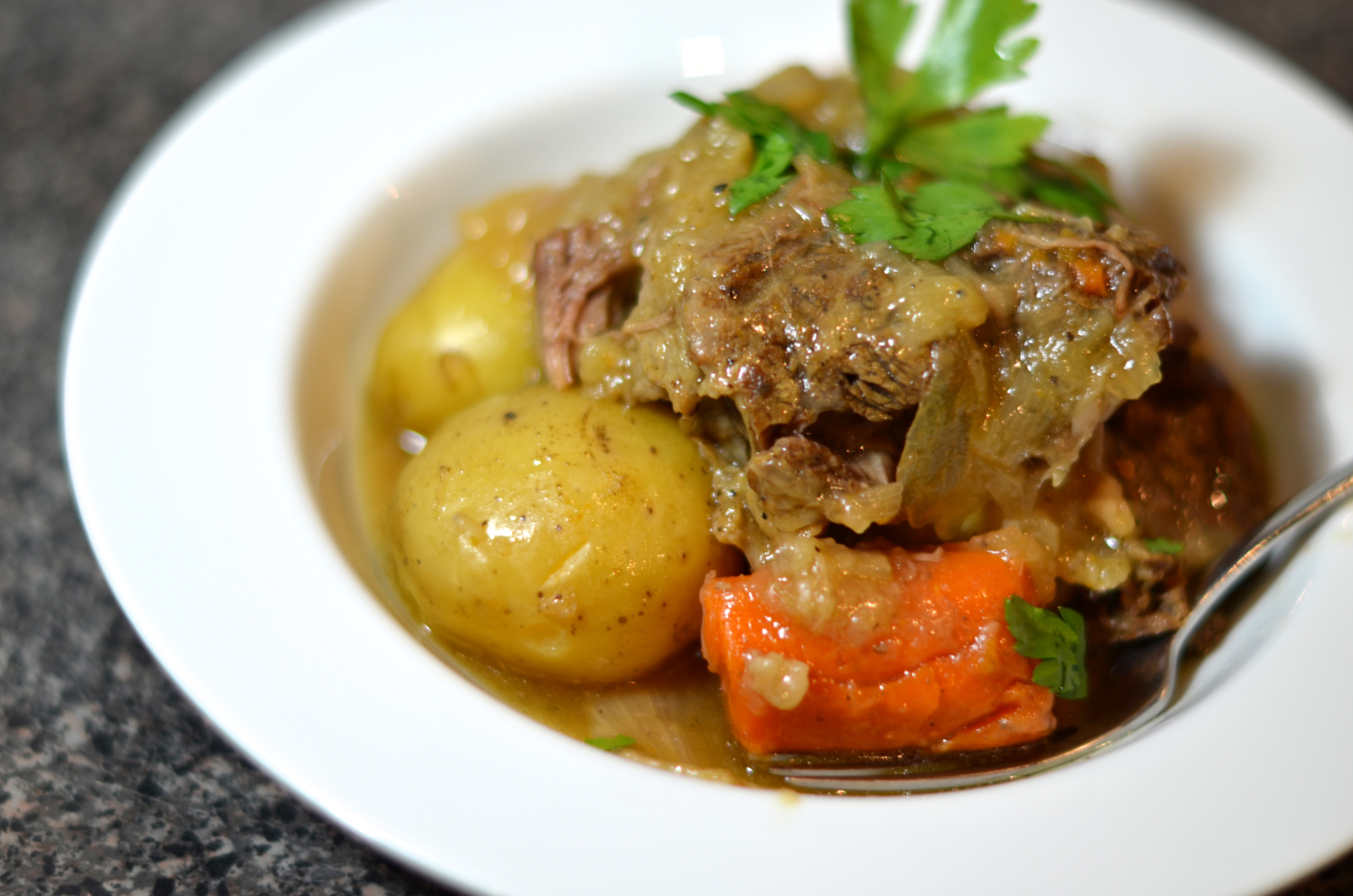 Option one (the way we did it growing up): Grab some tongs and pull out some meat, onions, carrots and potatoes and put in a bowl. Spoon some tasty cooking liquid on top. Eat.
