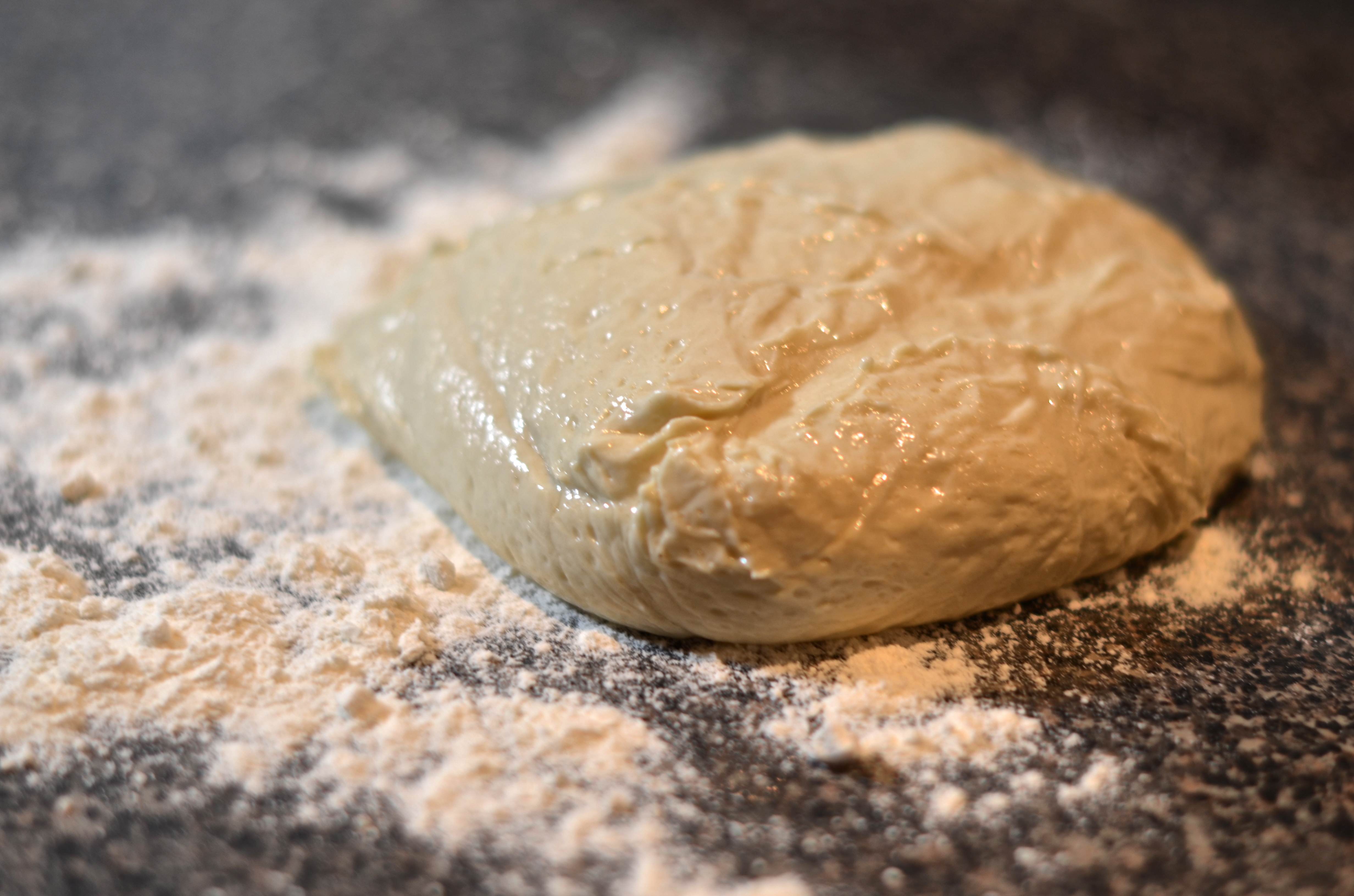 Let’s build a calzone. Keep your oven at 425°F and arrange the pizza stone on a rack in the middle of the oven. Let your dough rest at room temperature for about an hour before you want to stretch it. When the time comes, throw some flour down on the counter and go to town
