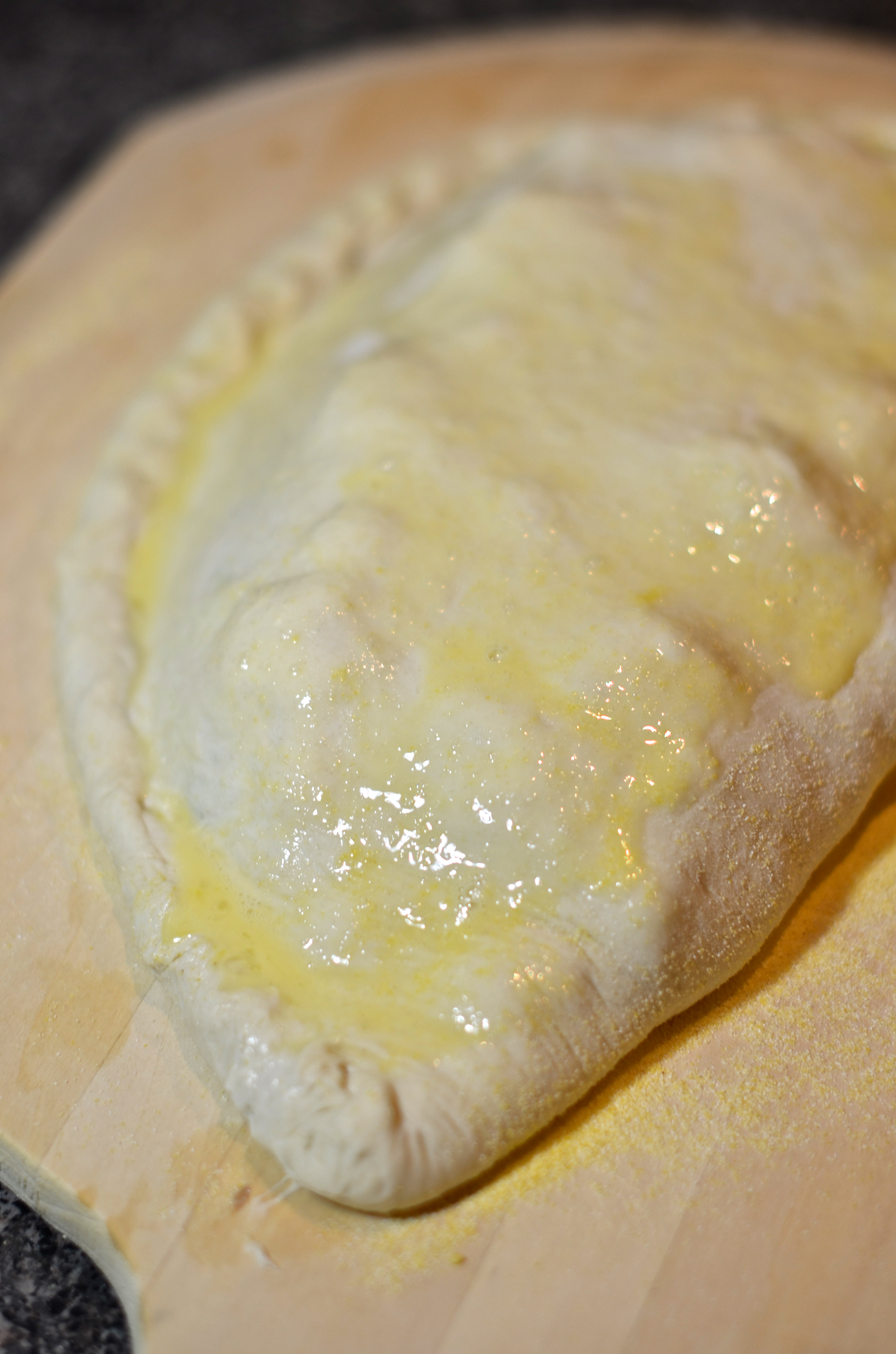 DSC_0368Now for the fun part. Moisten the edge of the dough with wet fingertips and use whatever technique you like to seal the calzone into a giant half-moon shape. I use the desperation technique, aka, whatever works. Once you’ve got the whole thing sealed up, brush with a beaten egg mixed with a bit of water to make a mo’ prettier crust.