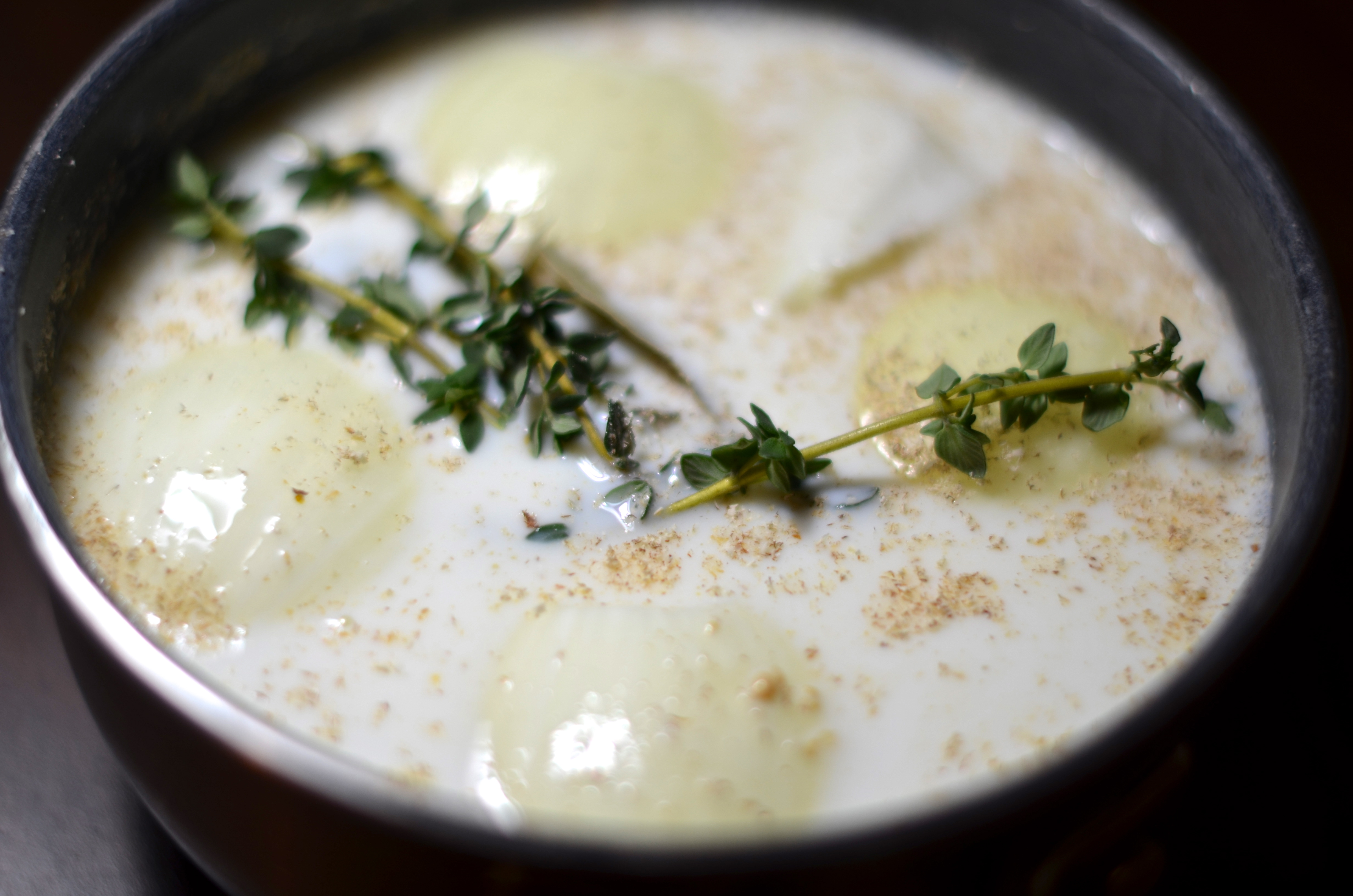 Let’s proceed. In a small saucepan, add the milk, onion, bay leaf, nutmeg, thyme and dry mustard. Heat gently over medium-low heat (taking care not to burn the milk) until all the flavors begin to meld and the milk begins to warm up. This will take about 10 minutes.