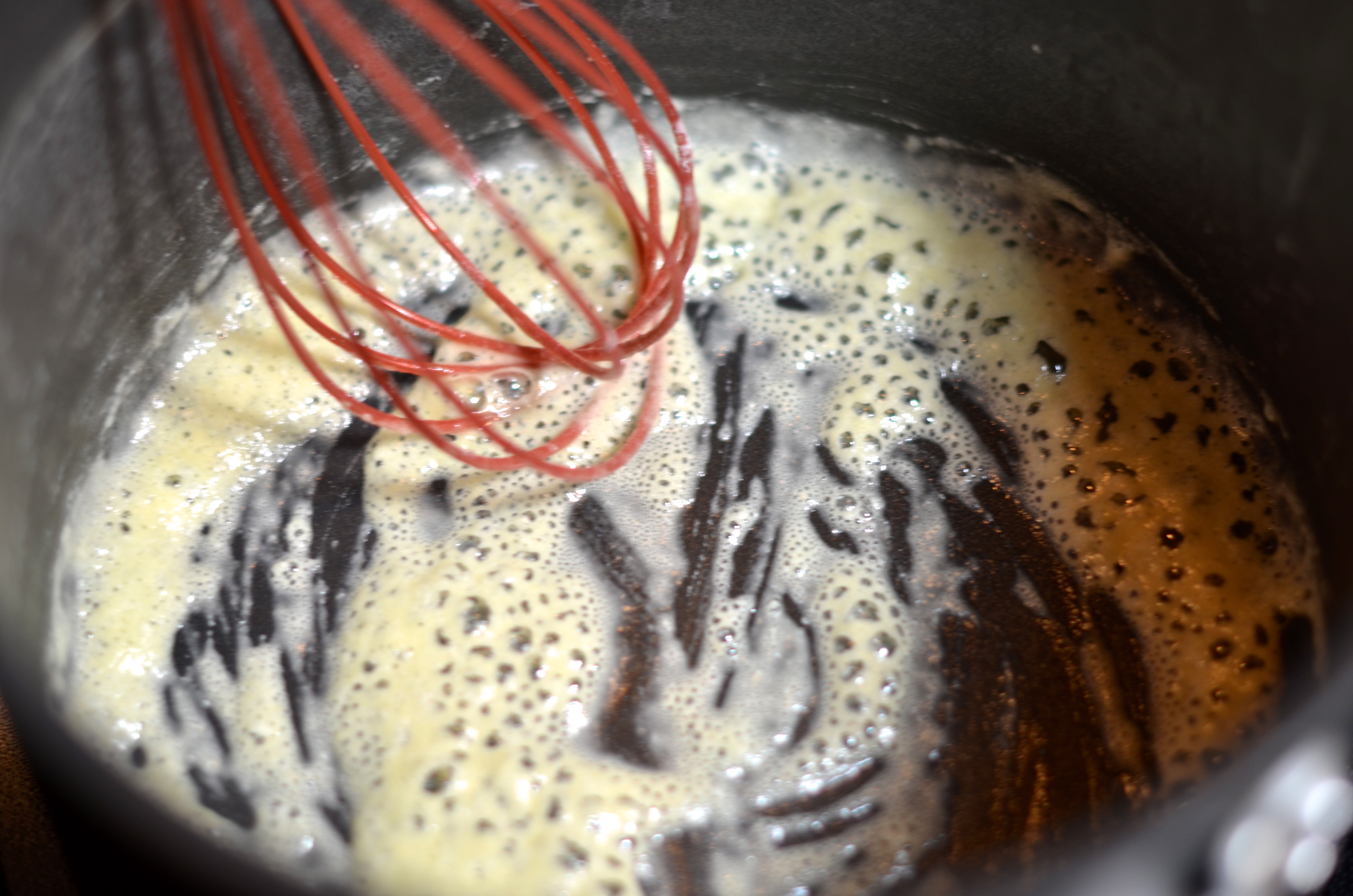 DSC_0693Add the milk in slowly, stirring constantly to avoid lumpiness. In order to ensure that the mixture thickens up, you need to bring the milk up to the boil. There shouldn’t be a reason to turn up the heat on the stove though. Cook the milk with the butter and flour for about 5 minutes or until things get thick. Like so.