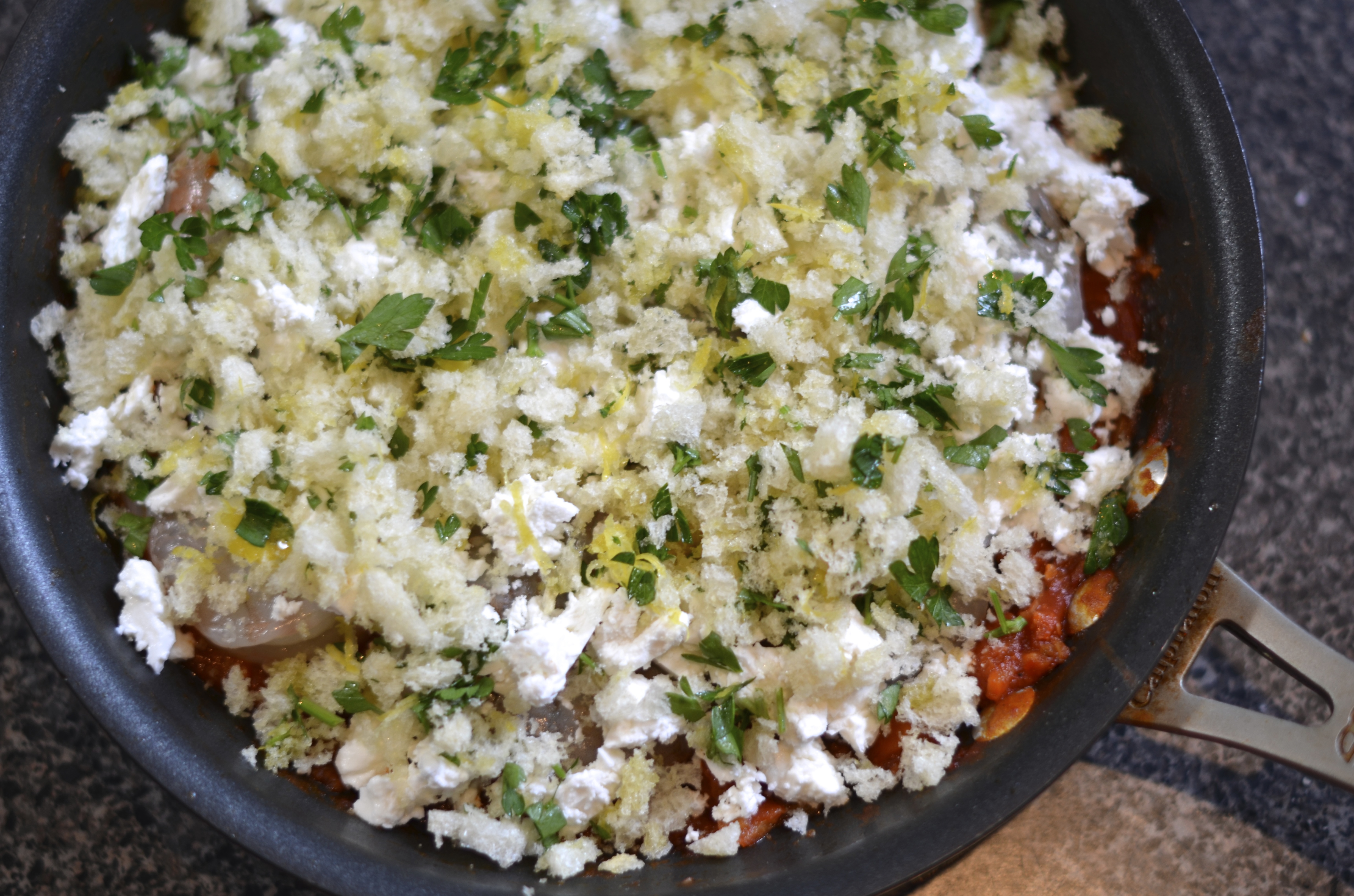 Let that cook for about 10 to 15 minutes so all the flavors can come together. While that’s going down, crank out some fresh breadcrumbs. Grab yesterday’s baguette if you didn’t eat it all (I didn’t) and give it a whir in the food processor. If you don’t have a food processor, you can chop up the baguette very small. Barring wanting to make fresh breadcrumbs at all, I suppose you could use panko. Mix the breadcrumbs, lemon zest and parsley together and add 2 tablespoons of olive oil.