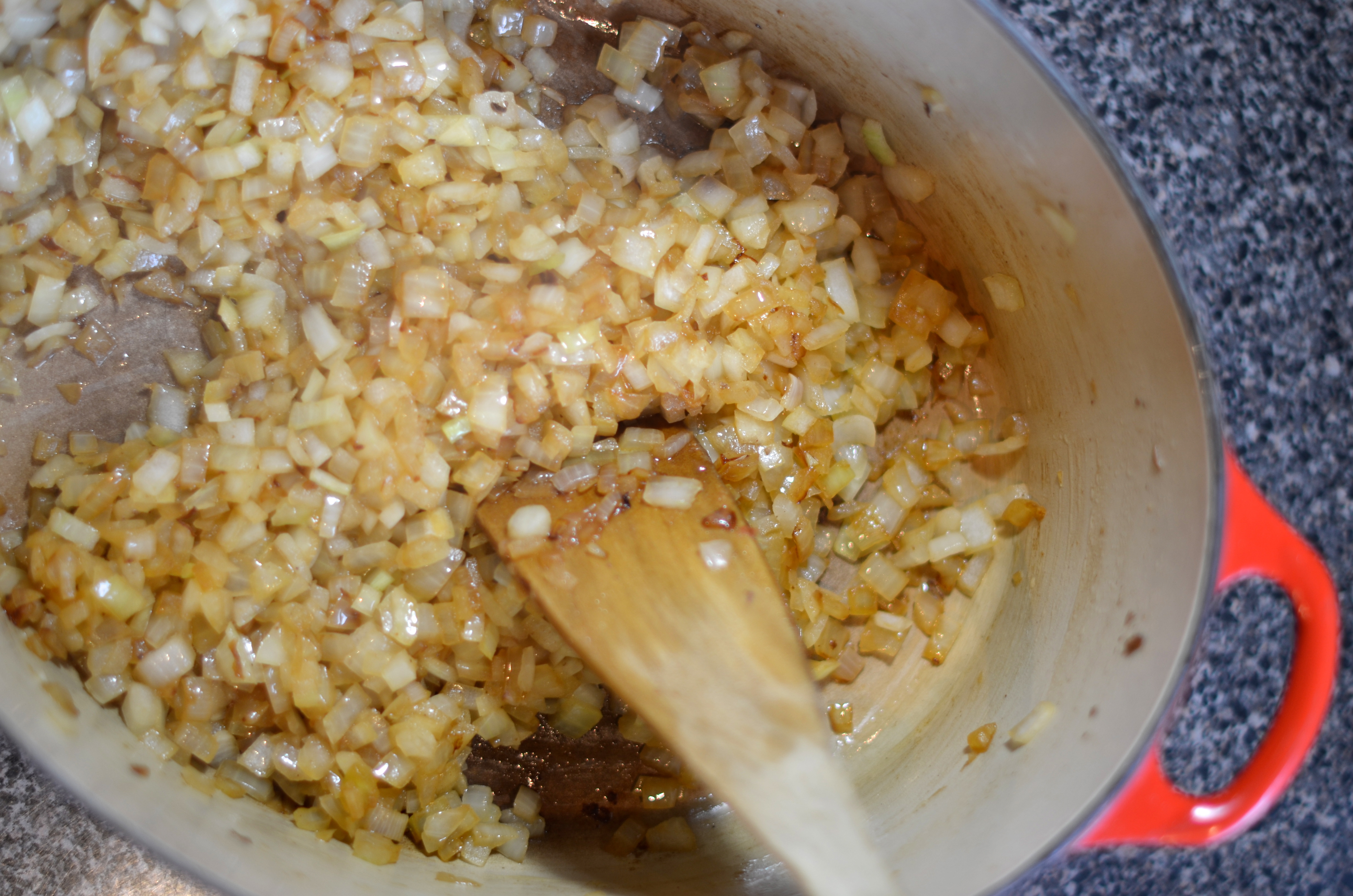 If you have an abundance of fat in the bottom of your pot, go ahead and dump it out and start with a new swirl of olive oil. Add the onions to the pot and cook until they are soft, slightly brown and translucent – 10 minutes?
