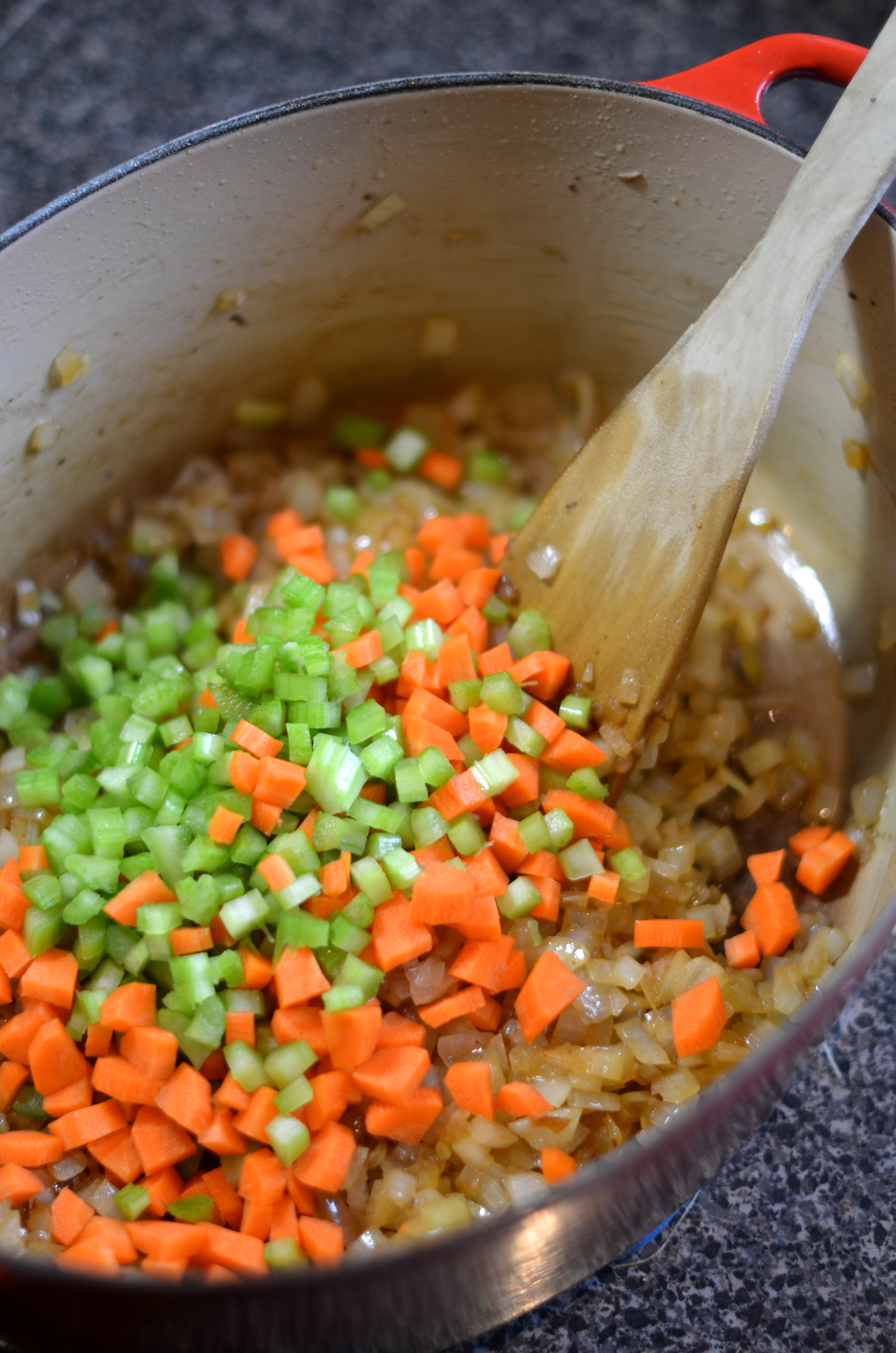 Well done. Now add in the garlic, celery, carrots, thyme and oregano and cook about 2-3 minutes until everything is merged.