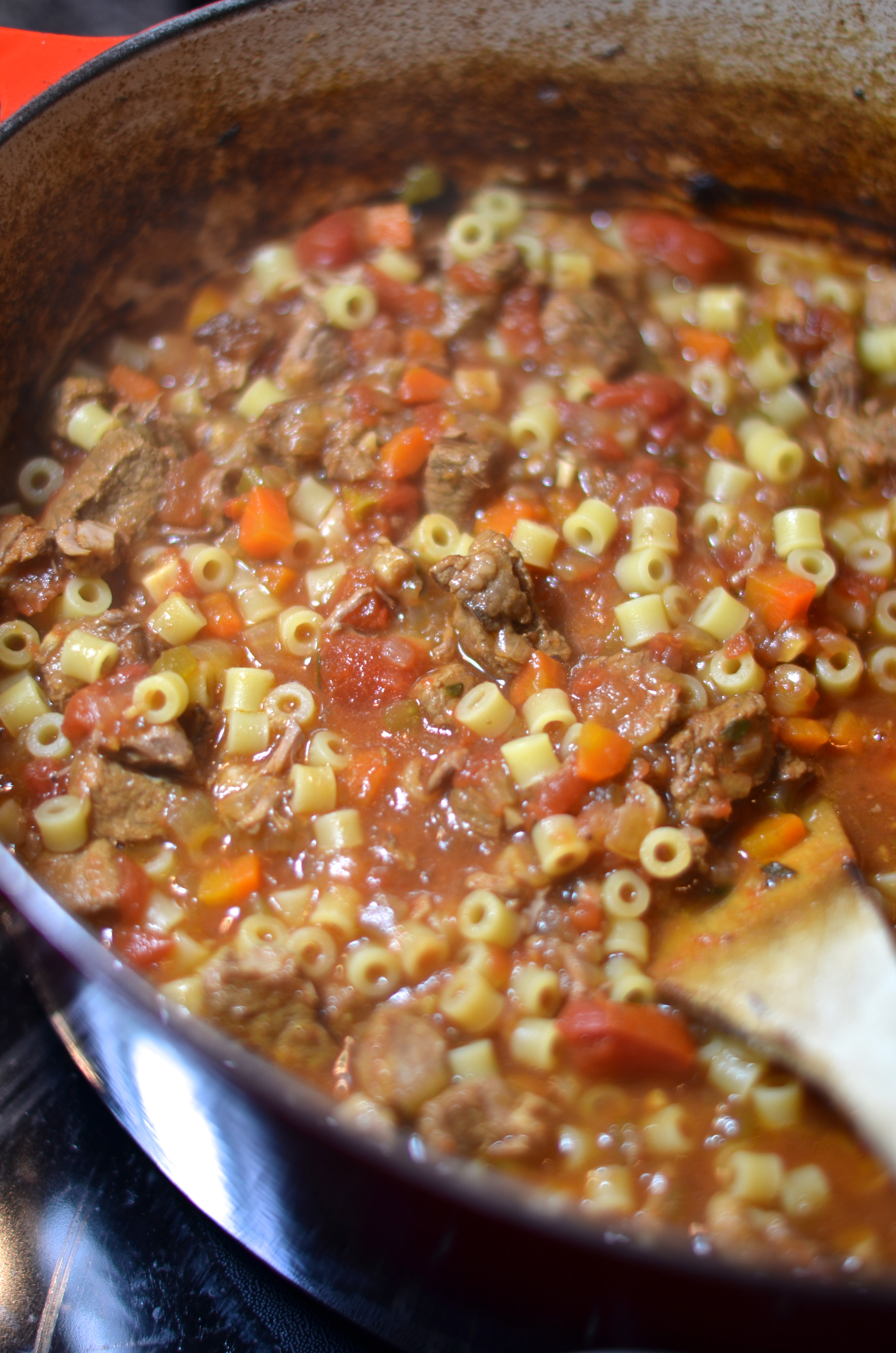 Now it’s time to turn to the pasta. Did you know that no matter how convenient it may seem, it’s never a good idea to add uncooked pasta to stew? You’ll end up with mushy pasta and no liquid whatsoever left in your pot. I learned the hard way – and surprisingly it took several times for me to catch on. So, with that in mind, bring some salted water to a boil and just undercook your ditalini in there.